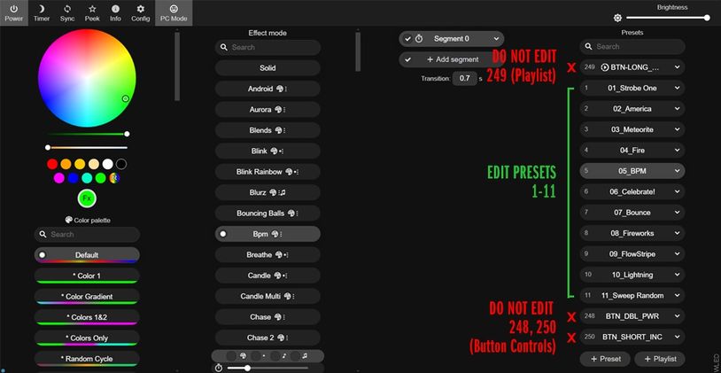 You may change any of the presets from 1-11 to use different patterns or color combinations. First use the instructions above to wirelessly connect to your unit using a mobile device or computer. Then, view the video below for step-by-step information.
